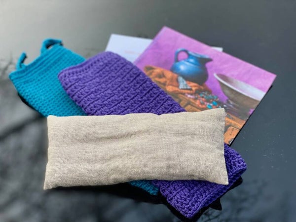 A pillow made from organic linen, stuffed with flaxseed and lavender, or flaxseed and lentils (your choice), all organic as well.