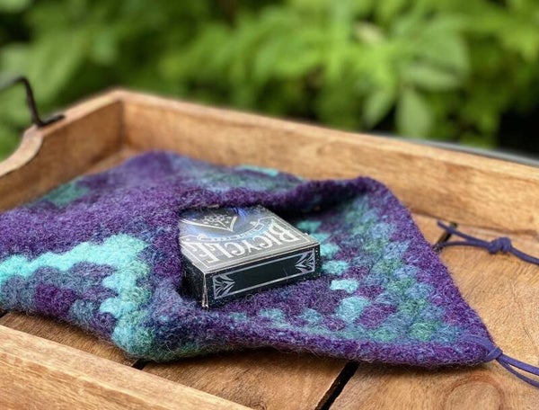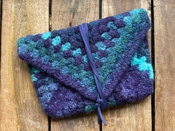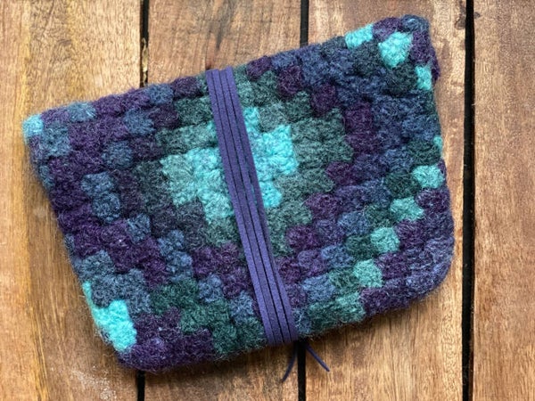 - Crocheted from 100% wool, felted afterwards. The cord is made from vegan/faux suede, which consists of polyester textile.