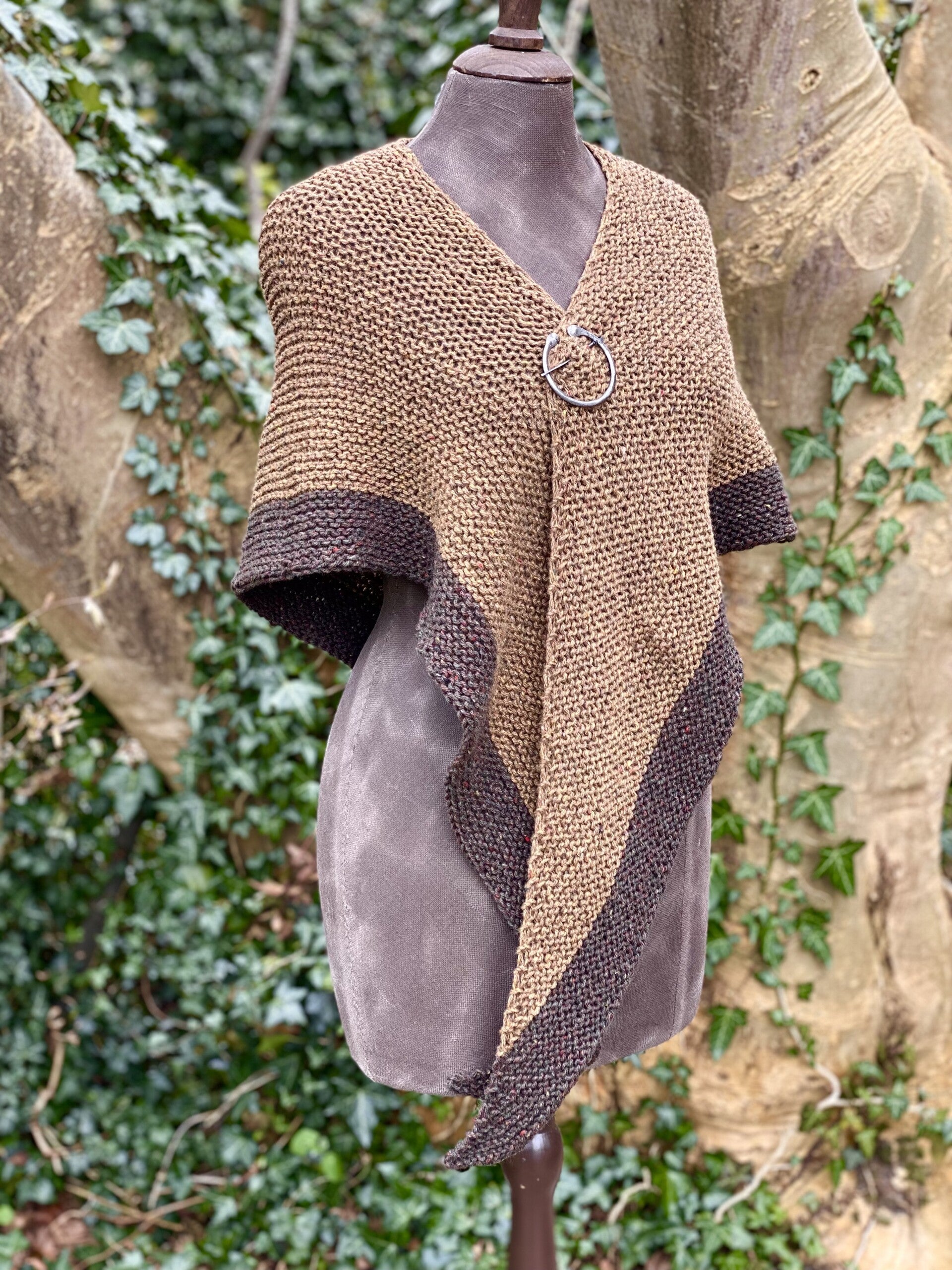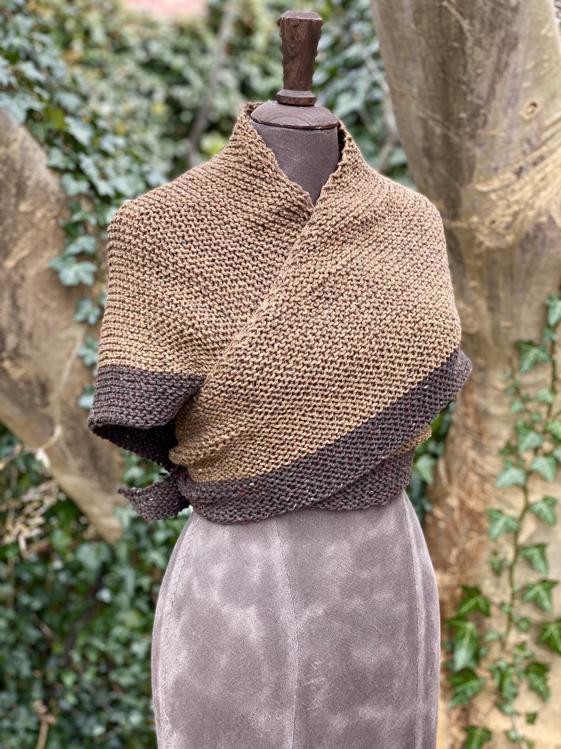 Je kunt hem als omslagdoek gebruiken zoals in de serie, maar ook als sjaal om de hals met de punt naar voren. Hij vormt makkelijk, en heeft extra lange 'vleugels' zodat de knoop blijft zitten.