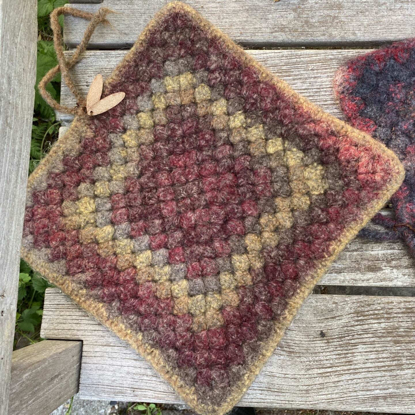 In essence, this mat is a very large granny square with reinforced edges and corners, and has been felted after crocheting. The result is a very pretty and very practical mat for just about all situations outside. The mat has a layer of natural rubber on the back so it is protected against damp grass.