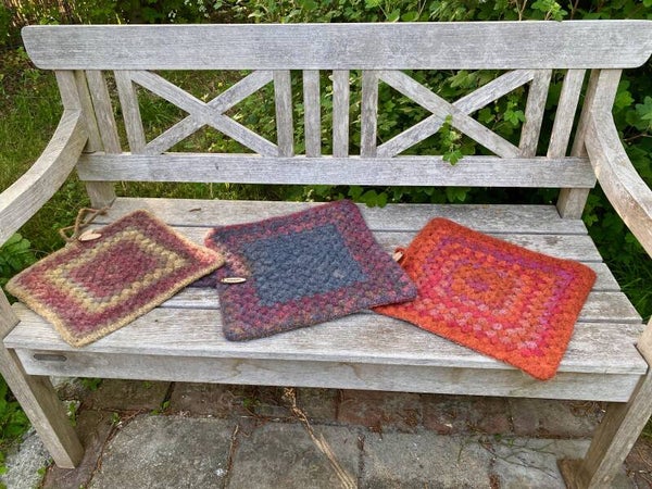 Deze matten zijn in wezen super grote granny squares van 100%, die na het haken vervilt zijn. Het resultaat is een super mooie en erg praktische zit-mat voor zo'n beetje alle situaties buiten. Ze hebben aan de achterkant een laagje natuur-rubber, zodat ze beschermen tegen vochtig gras bijvoorbeeld.