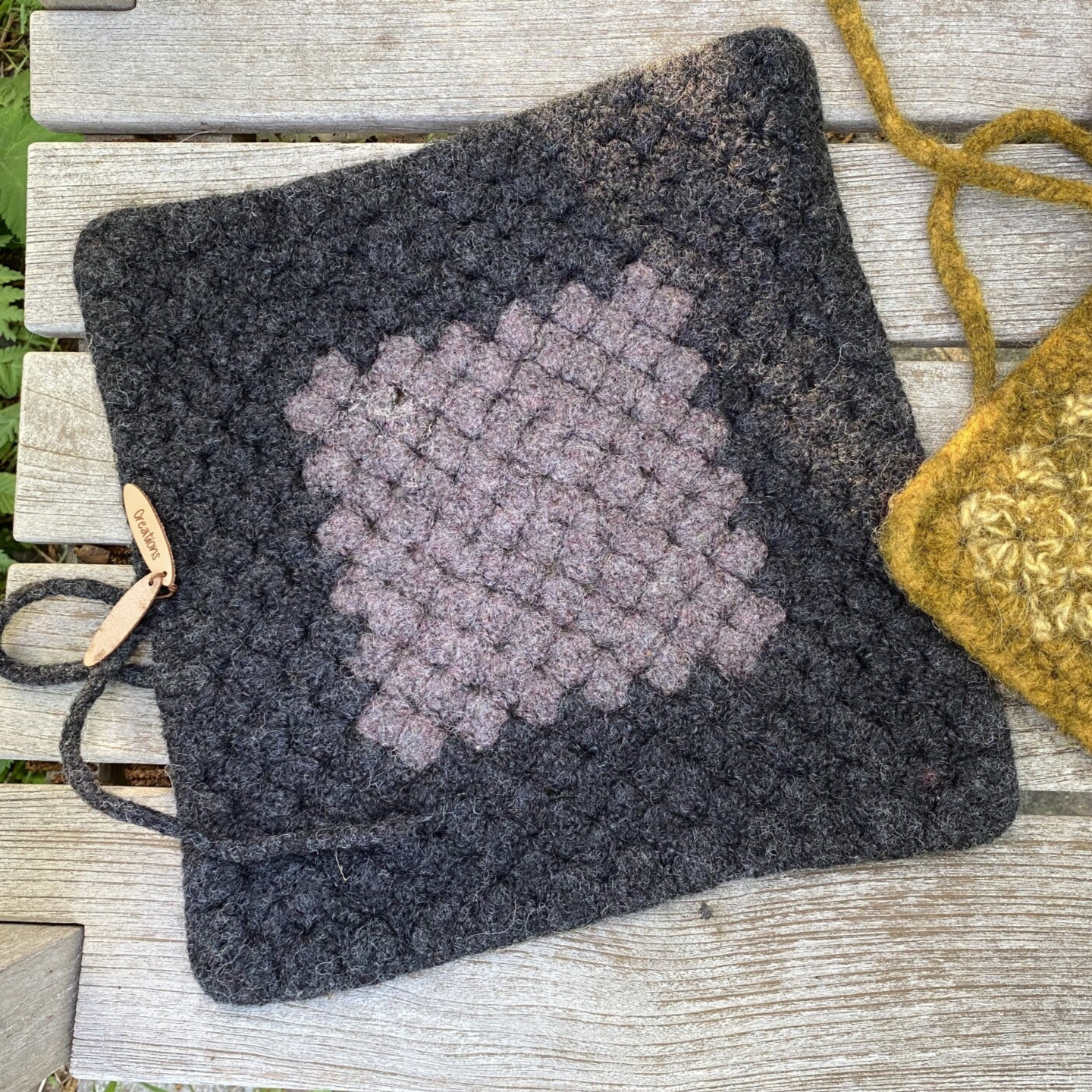 In essence, this mat is a very large granny square with reinforced edges and corners, and has been felted after crocheting. The result is a very pretty and very practical mat for just about all situations outside. The mat has a layer of natural rubber on the back so it is protected against damp grass.