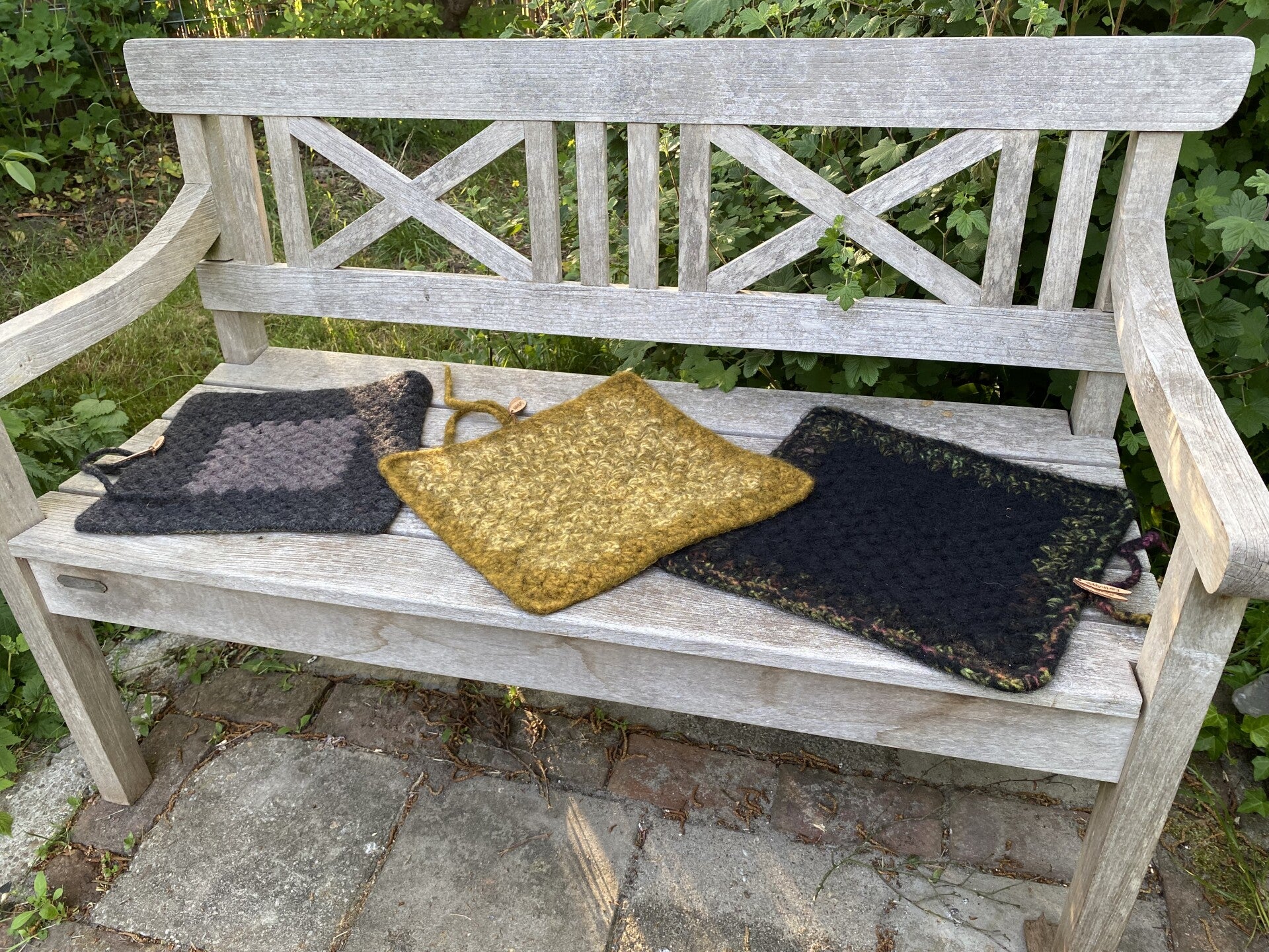 In essence, this mat is a very large granny square with reinforced edges and corners, and has been felted after crocheting. The result is a very pretty and very practical mat for just about all situations outside. The mat has a layer of natural rubber on the back so it is protected against damp grass.