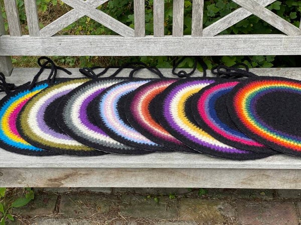 A pretty, but also very practical mat, suitable for just about all outdoor situations: the woolen mat is crocheted and felted afterwards, making it very insulating against cold from the below. And the waterproof back makes you safe against cold or wet surfaces.