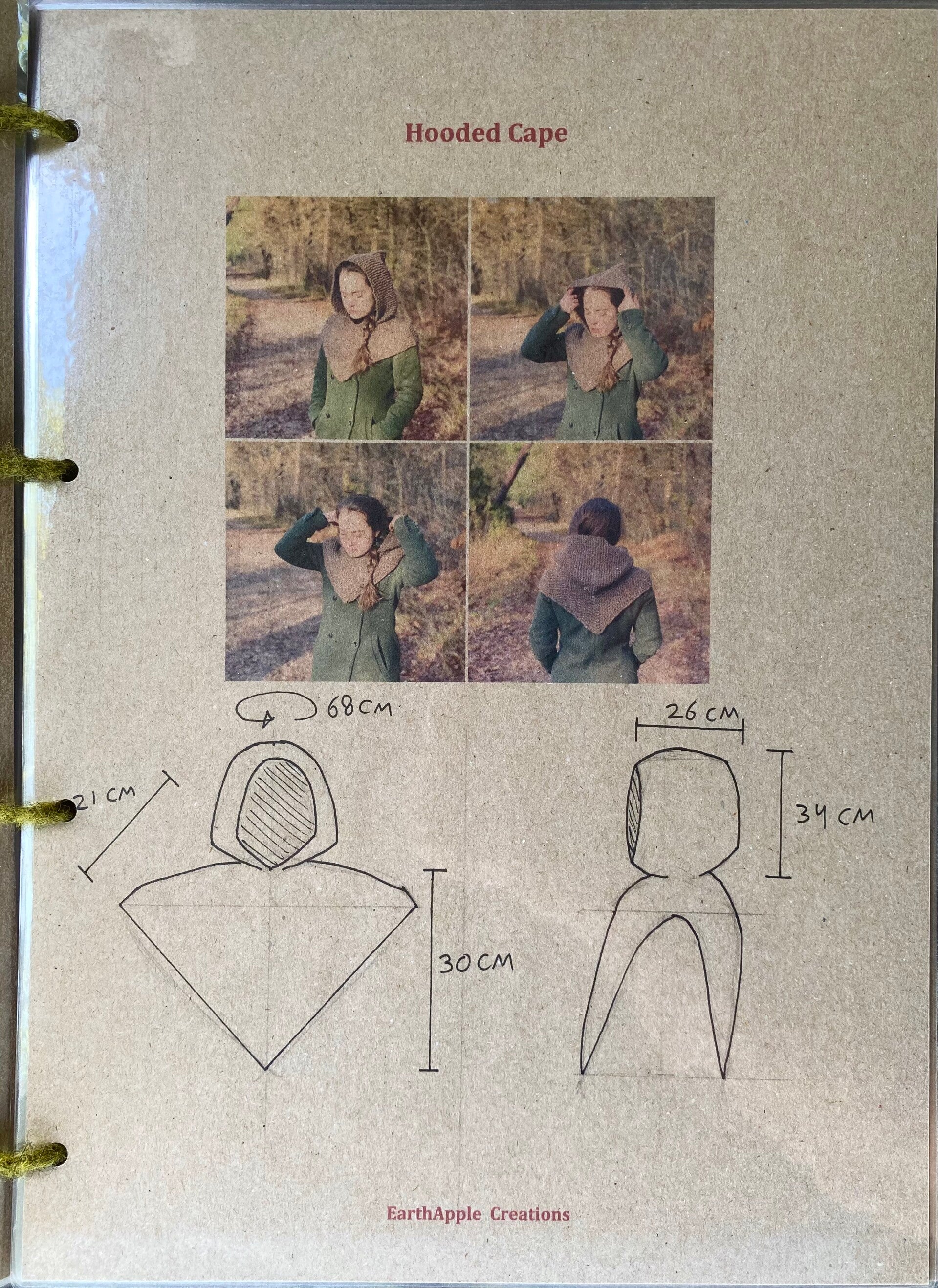 - Maten: Hood 26 cm deep and 34 cm hoog. De halsopening van de cape is ongeveer 68 cm omtrek, en rekbaar. Van hals tot punt 30 cm, van schouder tot rand 21 cm.