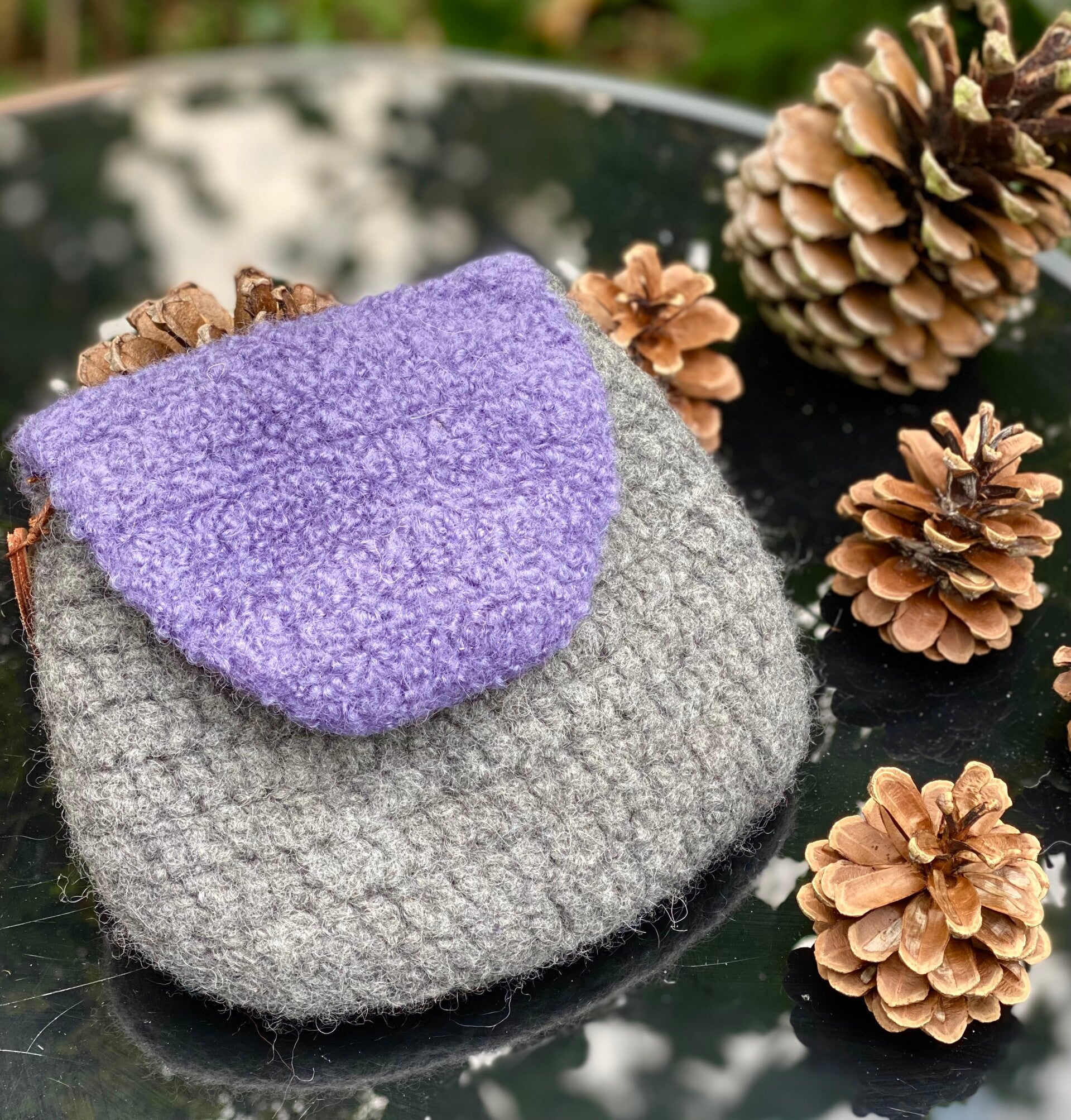 - Crocheted from 100% wool, then felted.