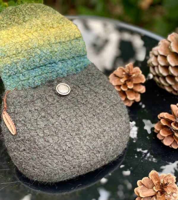 - Crocheted from 100% wool, then felted.