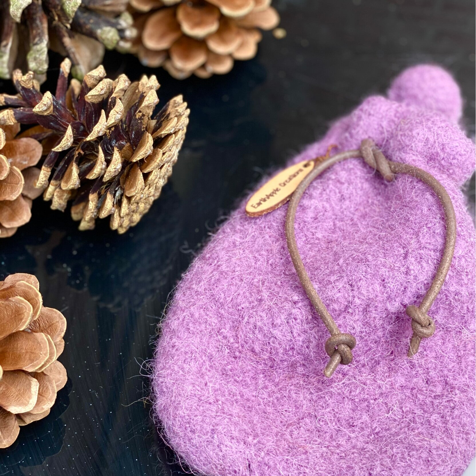 - Materials: Crocheted from 100% wool from Norway, then felted. Cord = leather.