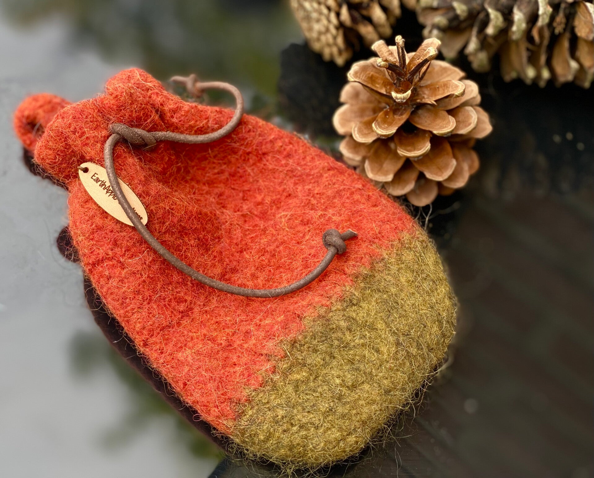 - Materials: Crocheted from 100% wool, then felted. Cord = leather.