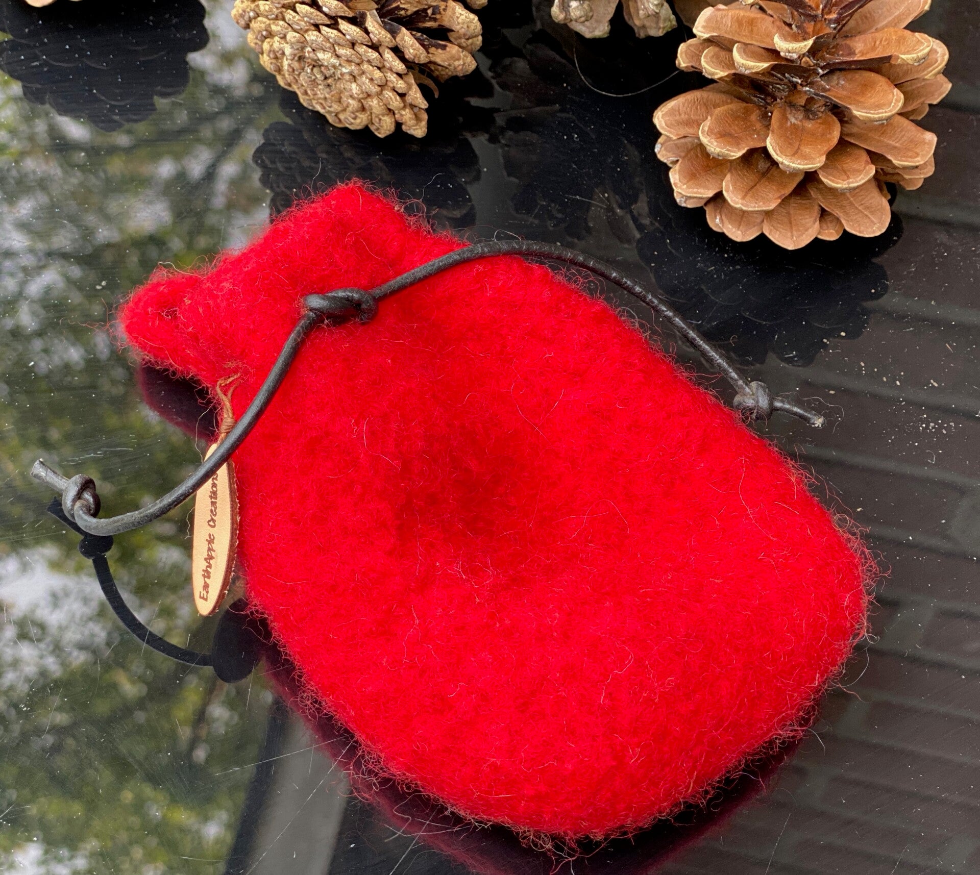 - Materials: Crocheted from 100% wool from Iceland, then felted. Cord = leather.
