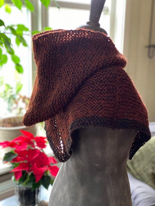 Ernstig gave, gebreide wollen hood met dichte korte cape, geïnspireerd door de Skjoldehamn capouchon, een viking vondst in Noorwegen uit ong 1050.